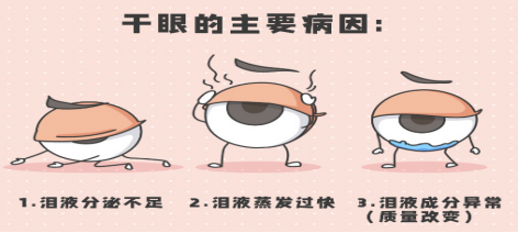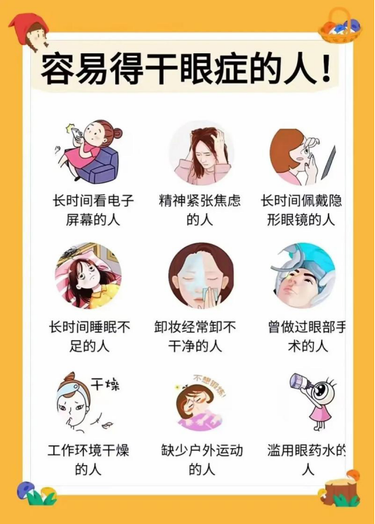 干眼症分为水液缺乏型干眼、蒸发过强型干眼、黏蛋白缺乏型干眼、泪液动力学异常型干眼、混合型干眼五类。其危险因素主要有:老龄、女性、高海拔、糖尿病、翼状胬肉、空气污染、眼药水滥用、使用视频终端、角膜屈光手术、过敏性眼病和部分全身性疾病等。