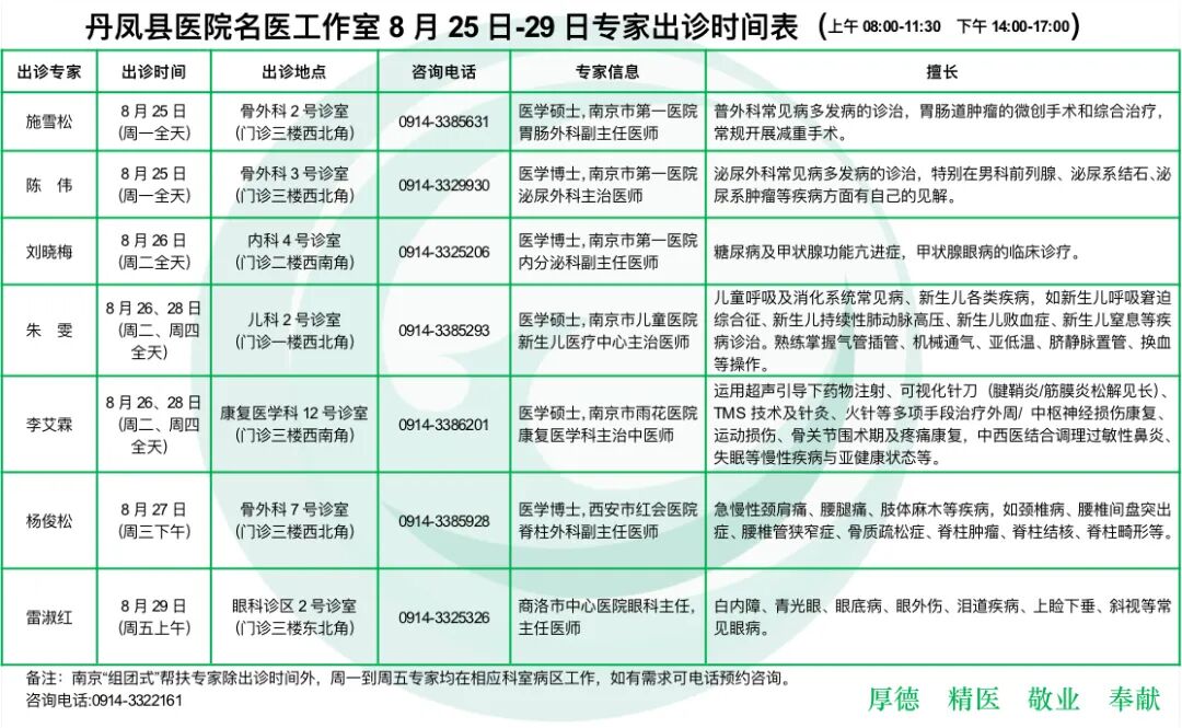 专家门诊地点:丹凤县医院门诊3楼骨外科2号诊室。