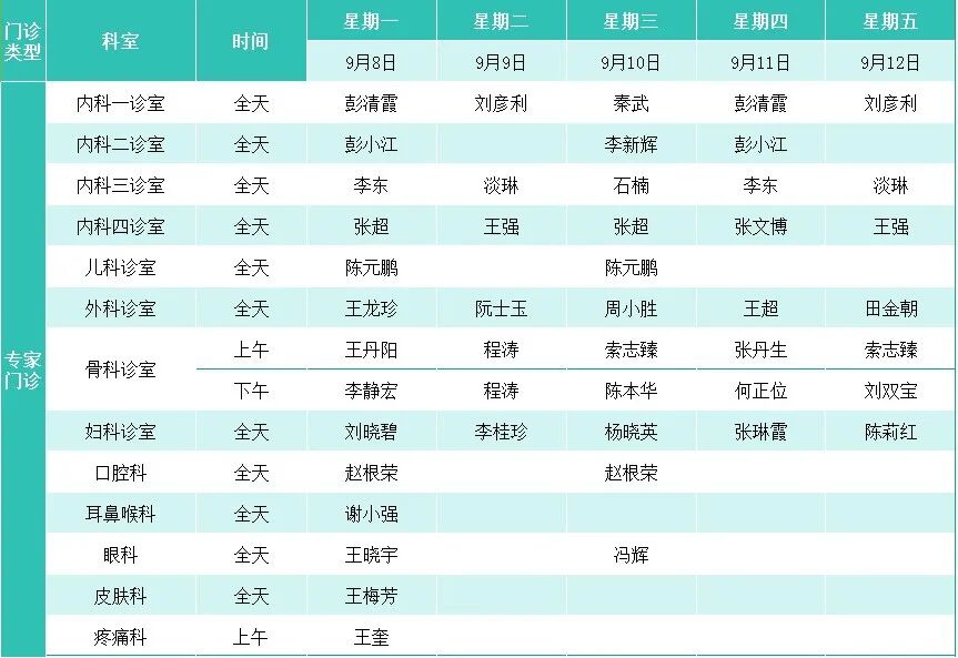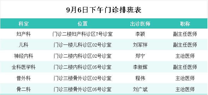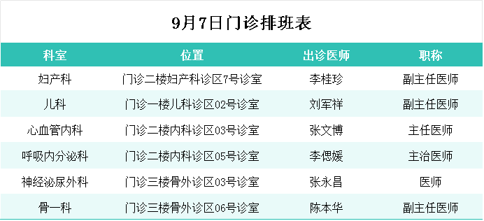 为方便大家就医,现将9月6日-12日(本周六至下周五)周末门诊、专家门诊、普通门诊出诊安排告知如下: