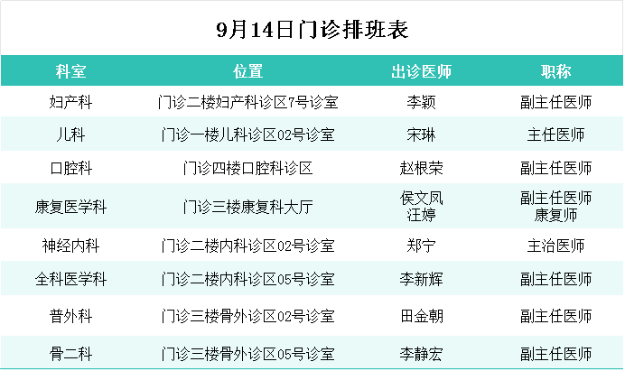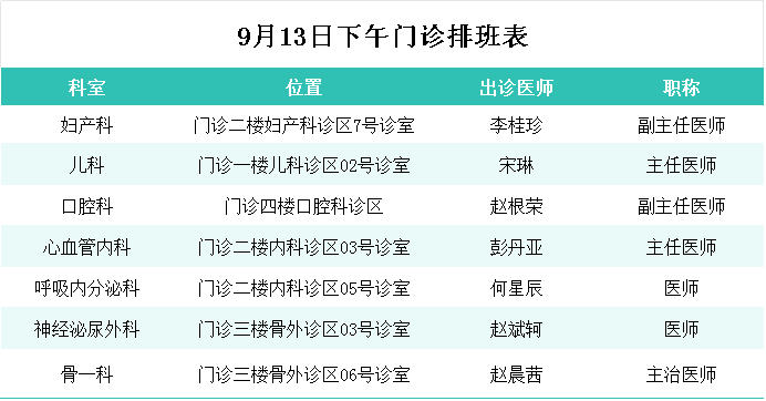 为方便大家就医,现将9月13日-19日(本周六至下周五)周末门诊、专家门诊、普通门诊出诊安排告知如下: