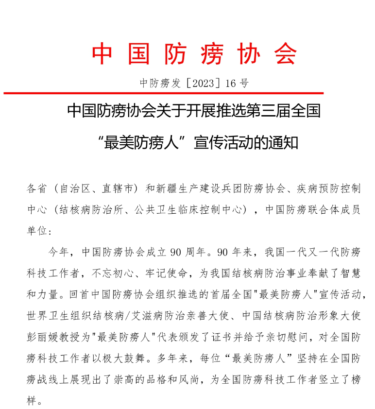“最美防痨人”评选,是为了弘扬全国防痨战线医疗卫生人员、科技工作者、志愿者等在结核病防治、科学研究与转化、公益事业与科普宣传中的无私奉献的精神,树立典型人物、宣传优秀团队。今年,又是中国防痨协会成立 90 周年。90年来,我国一代又一代防痨科技工作者,不忘初心、牢记使命,为我国结核病防治事业奉献了智慧和力量。回首中国防痨协会组织推选的首届全国"最美防痨人"宣传活动,世界卫生组织结核病/艾滋病防治亲善大使、中国结核病防治形象大使彭丽媛教授为"最美防痨人"代表颁发了证书并给予亲切慰问,对全国防痨科技工作者以极大鼓舞。多年来,每位“最美防痨人”坚持在全国防痨战线上展现出了崇高的品格和风尚,为全国防痨科技工作者竖立了榜样。![]()