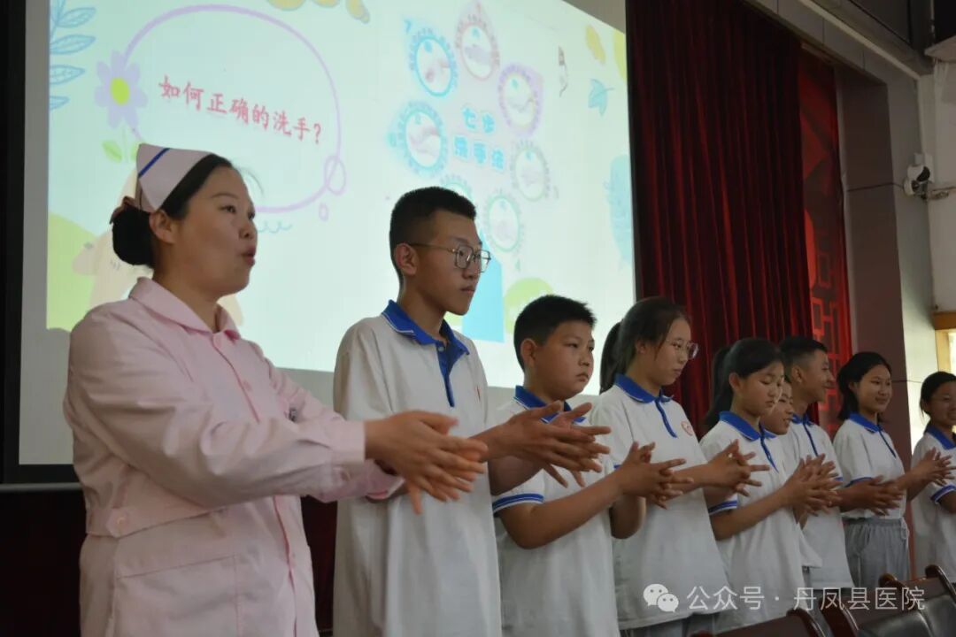 丹凤县医院儿科护士长赵章敏演示了七步洗手法,并带领同学们共同学习规范的七步洗手法,由每班派出两名学生代表给大家共同演示,保证日常生活中同学们能够更加认真地做到手卫生,远离传染病。