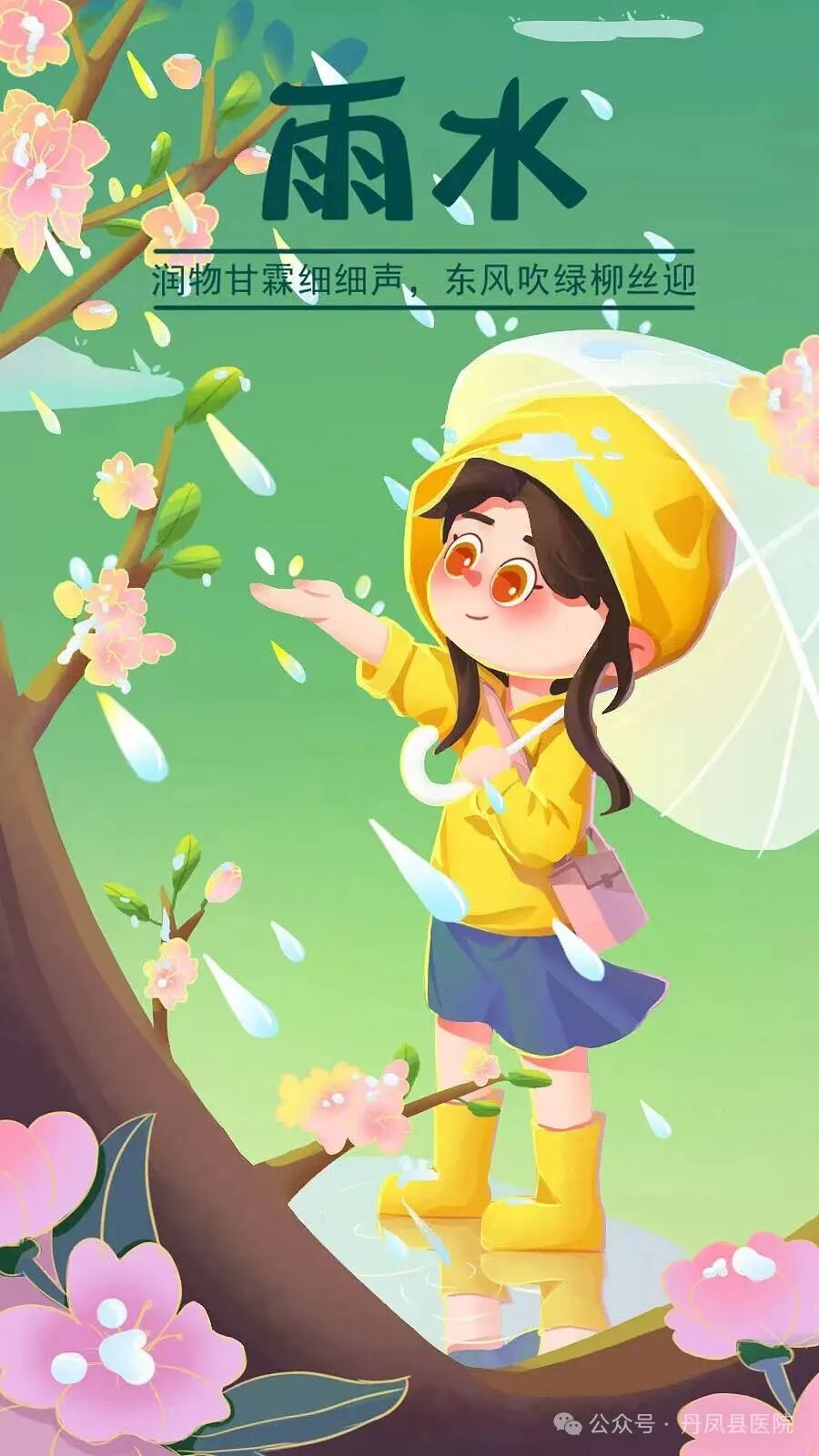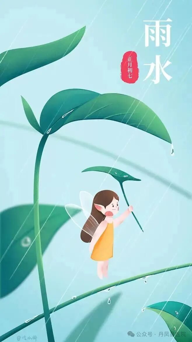 每年2月18~20日,太阳位于黄经330°时是雨水节气,雨水是二十四节气中的第二个节气。《月令七十二候集解》:“正月中。天一生水。春始属木,然生木者必水也,故立春后继之雨水。且东风既解冻,则散而为矣。”此时,气温回升,冰雪融化。天上有雨,地上有流水,水活万物,故称“雨水”。