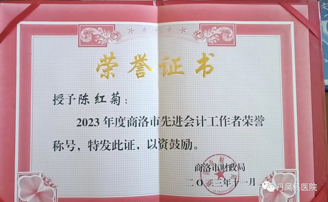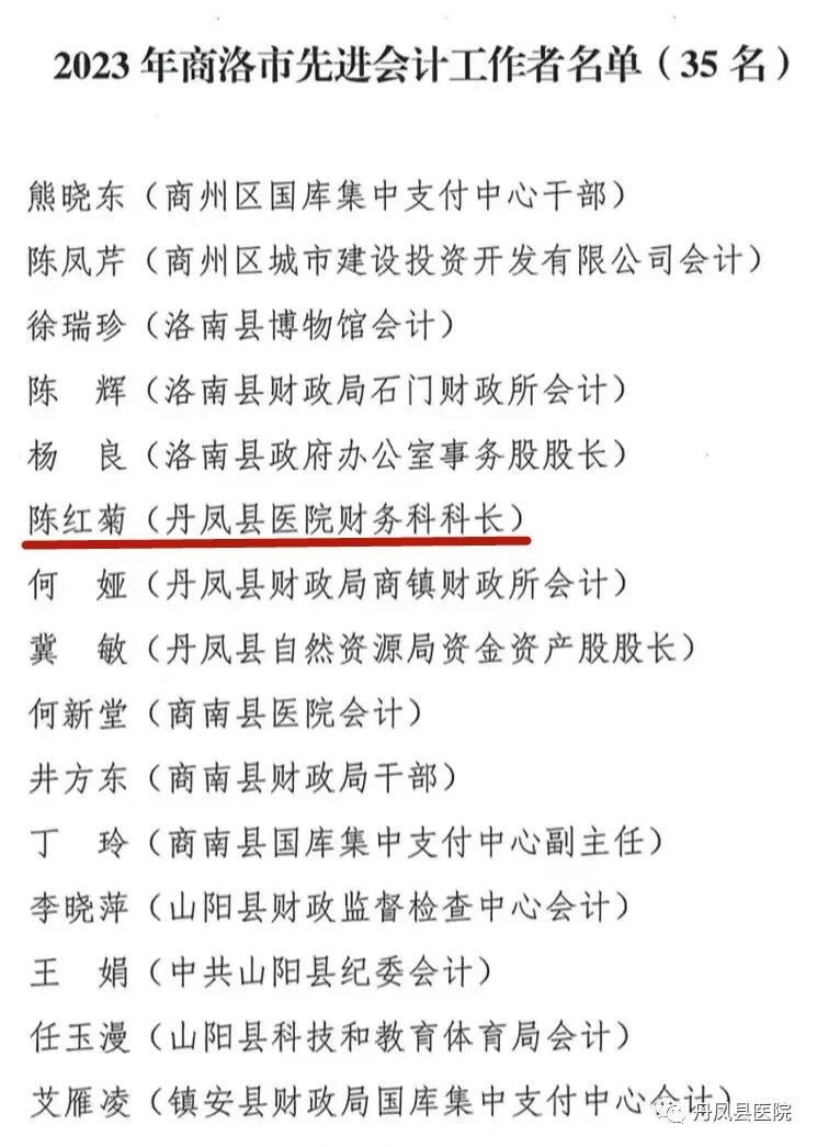 近日,商洛市财政局评选表彰了一批先进会计工作集体和先进会计工作者,其中,丹凤县医院总会计师陈红菊被评选为2023年商洛市先进会计工作者,这是近年来我院会计工作获得此项殊荣的一次突破。![]()