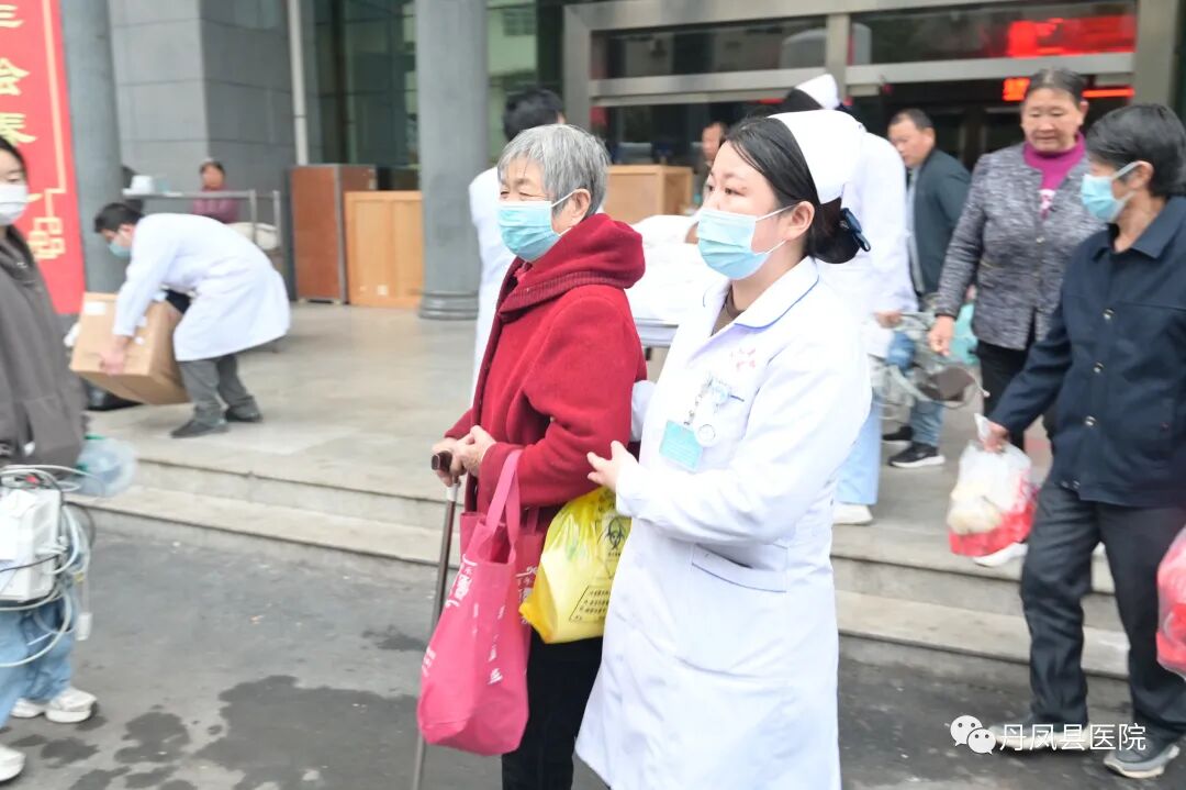 两辆中巴、4辆救护车,在北新街23号——丹凤县医院老院区住院楼前整装待发。中医科、老年医学科、消化内科、神经泌尿外科、骨三科的住院患者被分为急危重及普通患者,专车接送,专人陪护。7:09,