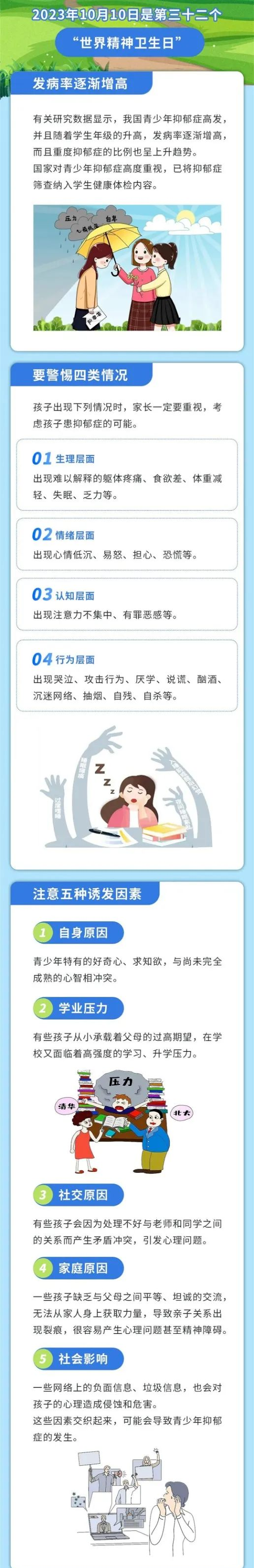 10月10日是世界精神卫生日。今年的主题是“促进儿童心理健康,共同守护美好未来”2020年心理健康蓝皮书《中国国民心理健康发展报告(2019~2020)》中,儿童的心理健康让我们揪心:24.6%的青少年抑郁,其中重度抑郁的比例为7.4%,每5个孩子中就有1个被抑郁所困扰。有研究发现,人一生的心理健康水平是会随年龄变化的,在12~18岁期间,人的心理健康水平会开始下降,并在18岁成年后开始回升,青少年儿童阶段正是出现心理问题的高发期。![]()