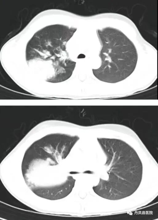 患儿男,6岁。以“发热6天,咳嗽3天”人院。患儿入院前6天出现发热,最高体温39.8℃,当地诊所治疗3天仍有发热,伴阵发性咳嗽,夜间最起为著,有痰不易咳出,遂来我院。入院查体:T37.3℃,PI12次/分,R26次/分 BP90/60mmHg,神志清楚,精神欠佳,咽部广泛充血,右上肺叩实音,左肺呼吸音粗,右肺呼吸音减弱,心律齐,心音有力。腹平软,肠鸣音4-5次/分,神经系统检查无明显异常。入院前检查:血常规:WBC6.06×109/L,L37.60%,M11.70%, N48.7%,RBC4.71×1012/L,HGB117g/L,PLT223×109/L,CRP7.8mg/L,hsCRP>5.0mg/L。肝肾功、血糖、电解质、心肌酶大致正常。凝血常规正常;痰培养:阴性;肺支原体gM抗体阳性;心电图示:窦性心动过速;胸部CT示:右肺中叶大叶性肺炎,两肺下叶支气管肺炎。入院诊断:支气管肺炎;肺炎支原体感染。诊疗经过:入院后给予阿奇霉素抗感染感染、溴己新化痰,布地奈德,特布他林雾化对症处理。经住院治疗13天,病情明显好转,出院后居家口服药物巩固治疗。出院2周病情完全恢复,复查CT无异常。![]()