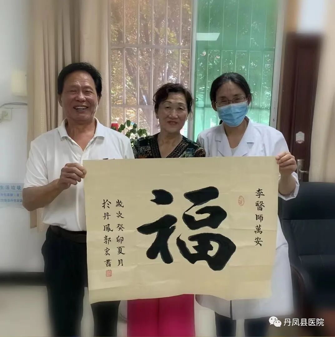 赤日炎炎,窗外蝉鸣阵阵,一对老年夫妇走进诊室,进门先是开心爽朗的笑声问候,伸出热情的双手紧紧的拉着李主任的手。随即,郭大叔拿出了自己亲书的一副“福”字送给李主任……