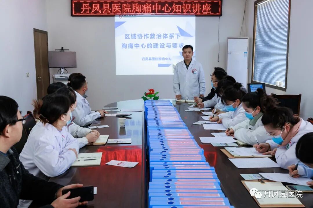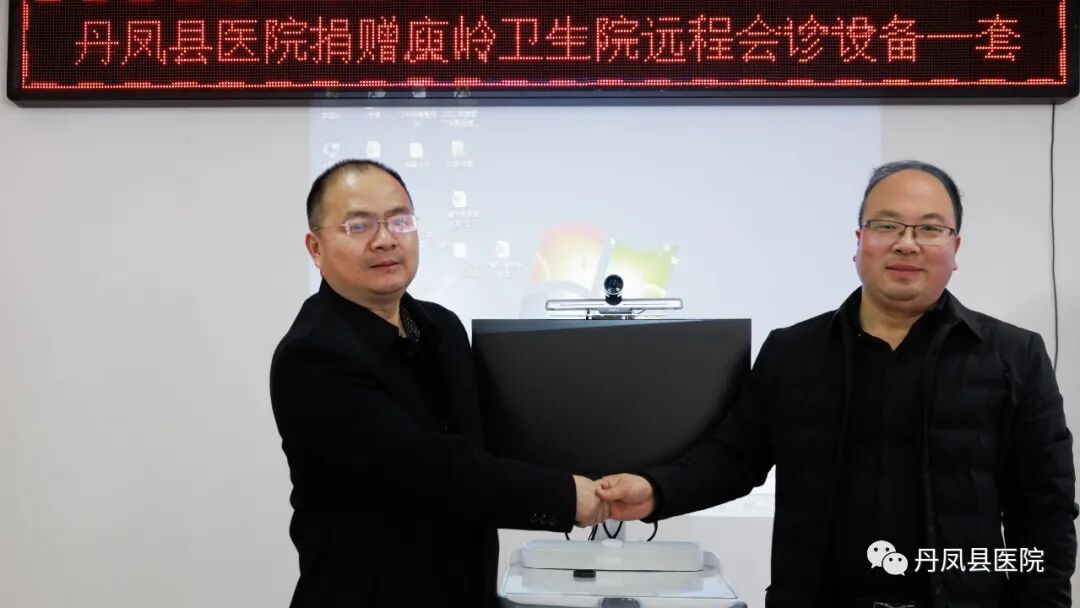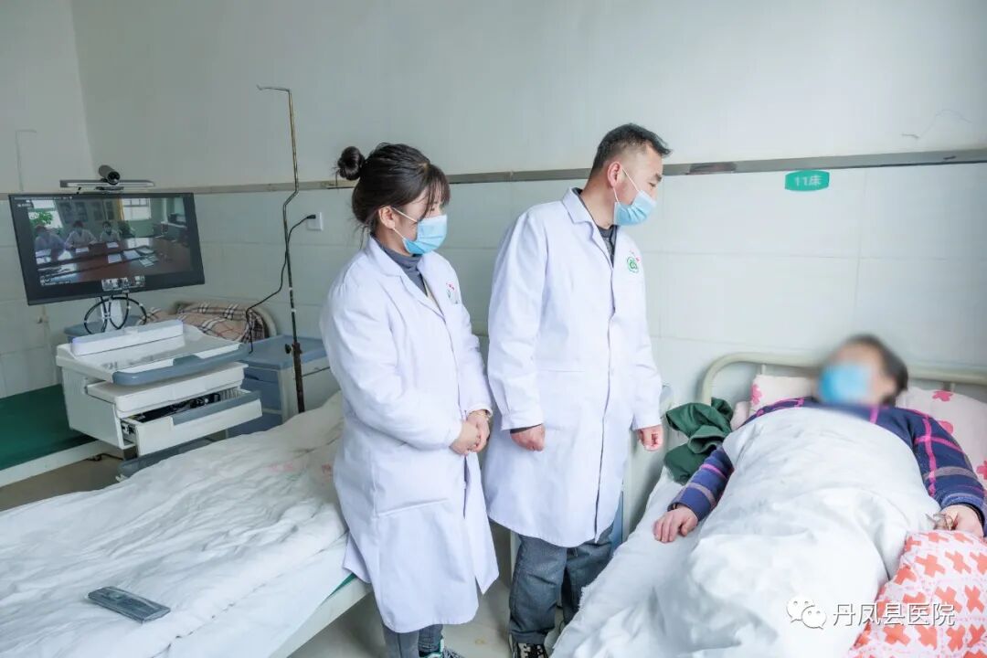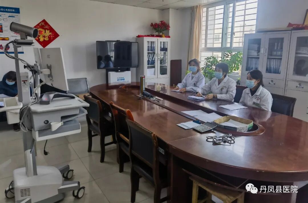 下图为丹凤县医院心内科的专家对庾岭镇中心卫生院的一名冠心病患者进行远程会诊。