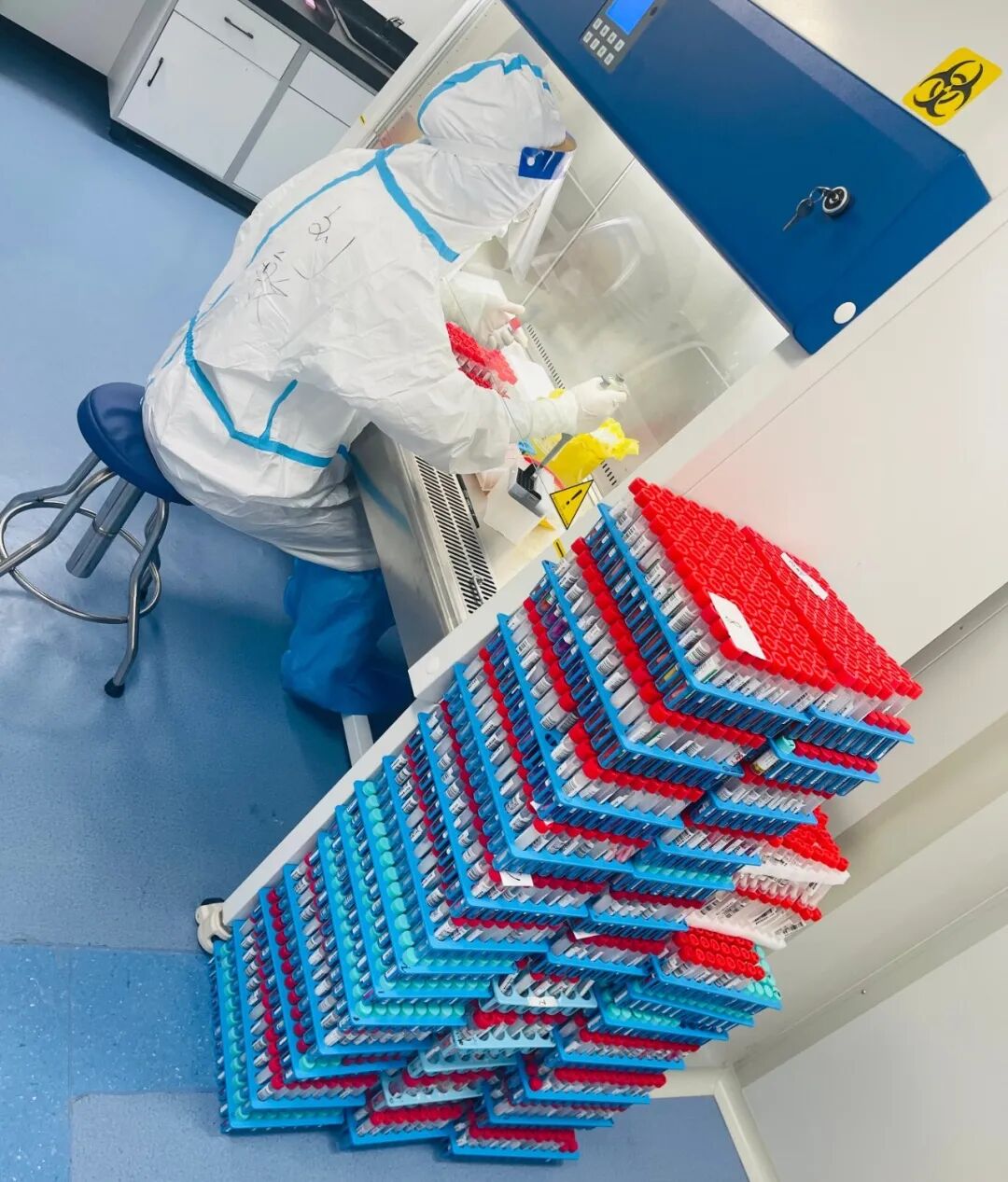 在每一次全员核酸检测中,主城区送至我院检测的标本有9万人份,全县域送至我院检测的标本14万人份,而一份份数不清的标本需要检验科9名工作人员(其中二区每次里面6人,4名检验师加样点样,2人支援扫码;负压环境外3人,1人负责实验扩增,2人收样本),在PCR实验室的负压环境中从早上6:30一直工作到晚上22:00左右方能全部检测完毕。