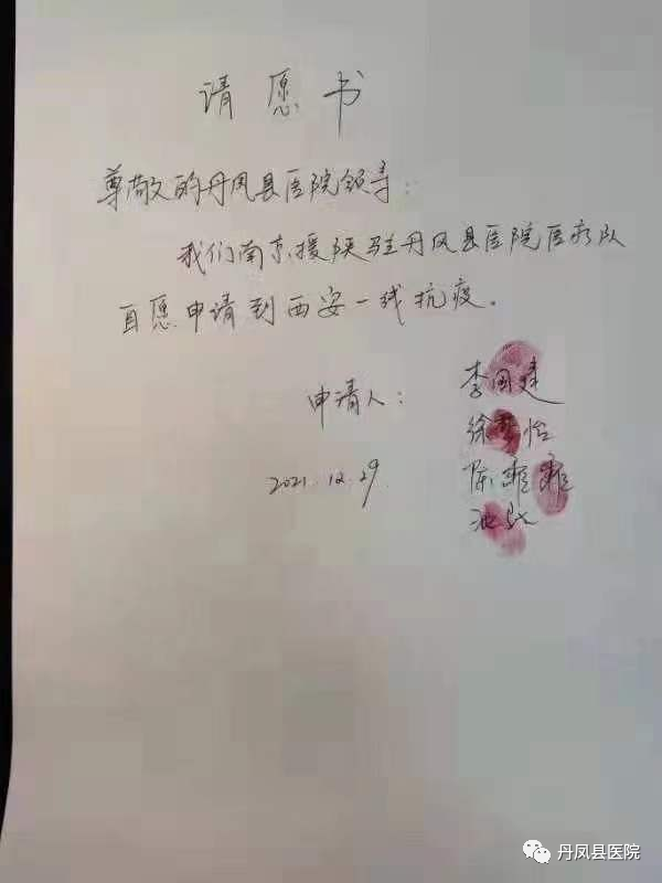 12月29日晚9:30,在接到我院须抽调第二批15名医护人员支援西安全员核酸采集工作的紧急通知后,短短半小时,百余名医护人员纷纷请缨,更有来自南京市第一医院支医的专家上交了按有指印的请愿书。晚10:00确定支援名单,检验科工作人员连夜为出征医护进行核酸检测。12月30日凌晨5:00,15名队员列队集结,向西安出发,保证8:00整装上岗。