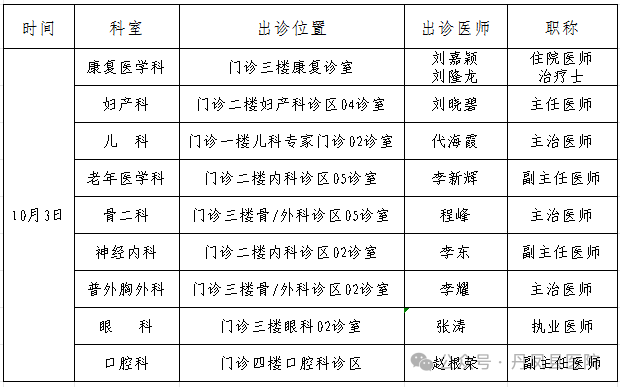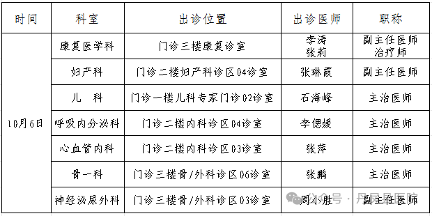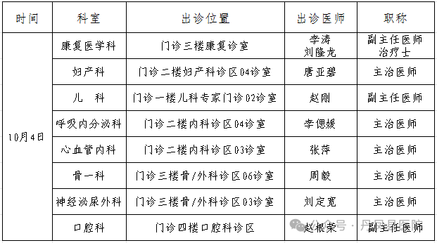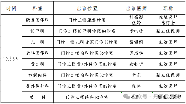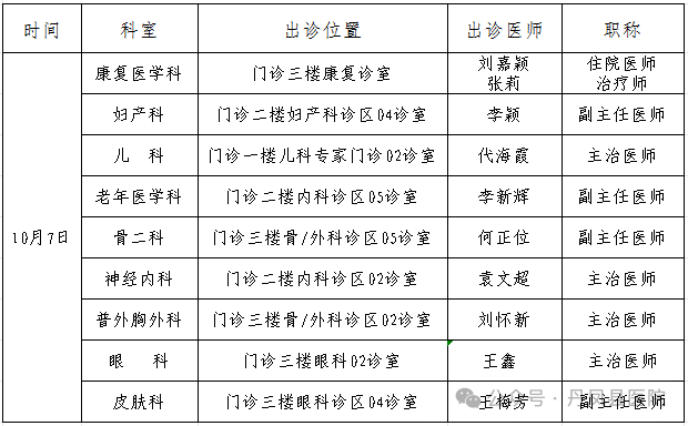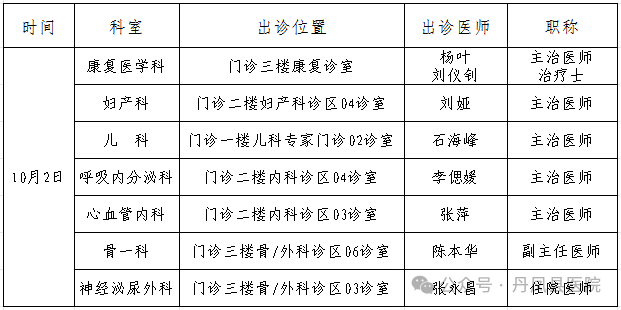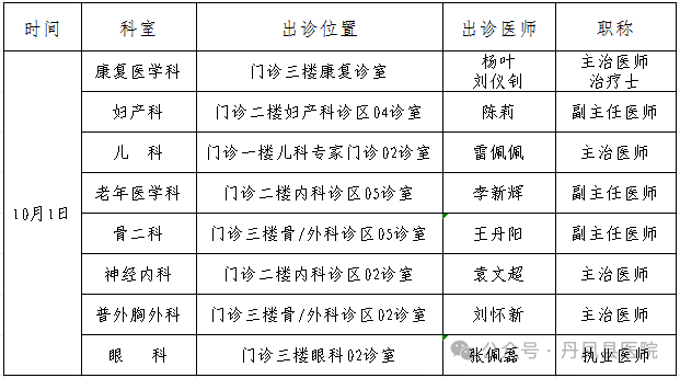 备注:1.国庆节期间,各辅助检查及收费、药房等窗口科室24小时开放;2.急诊科24小时开放。咨询电话:0914-3322161有就诊需求的市民朋友可根据以上排班表合理安排好您的就诊时间。 丹凤县医院