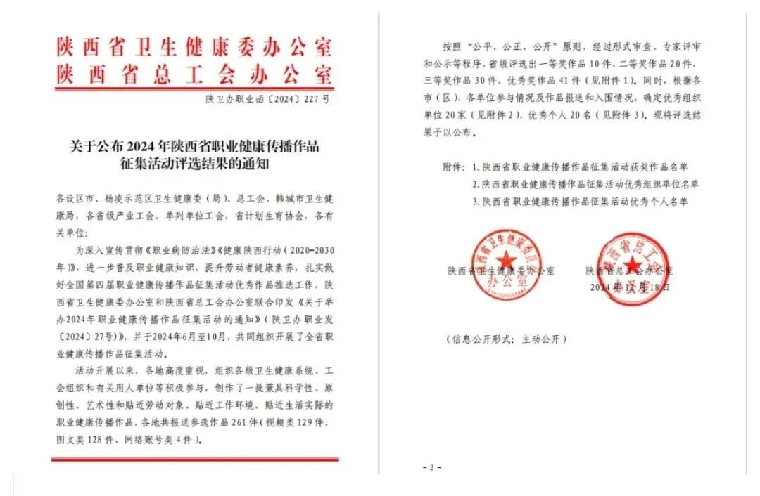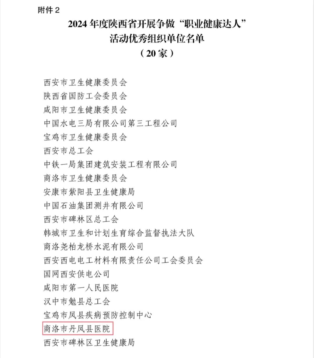 12月18日,陕西省卫生健康委和陕西省总工会公布2024年陕西省“职业健康达人”及活动优秀组织单位名单、职业健康传播作品征集活动评选结果。其中,丹凤县医院被评为争做“职业健康达人”优秀组织单位,健康管理中心参赛作品《职业病防治知识手册折页》荣获三等奖!
