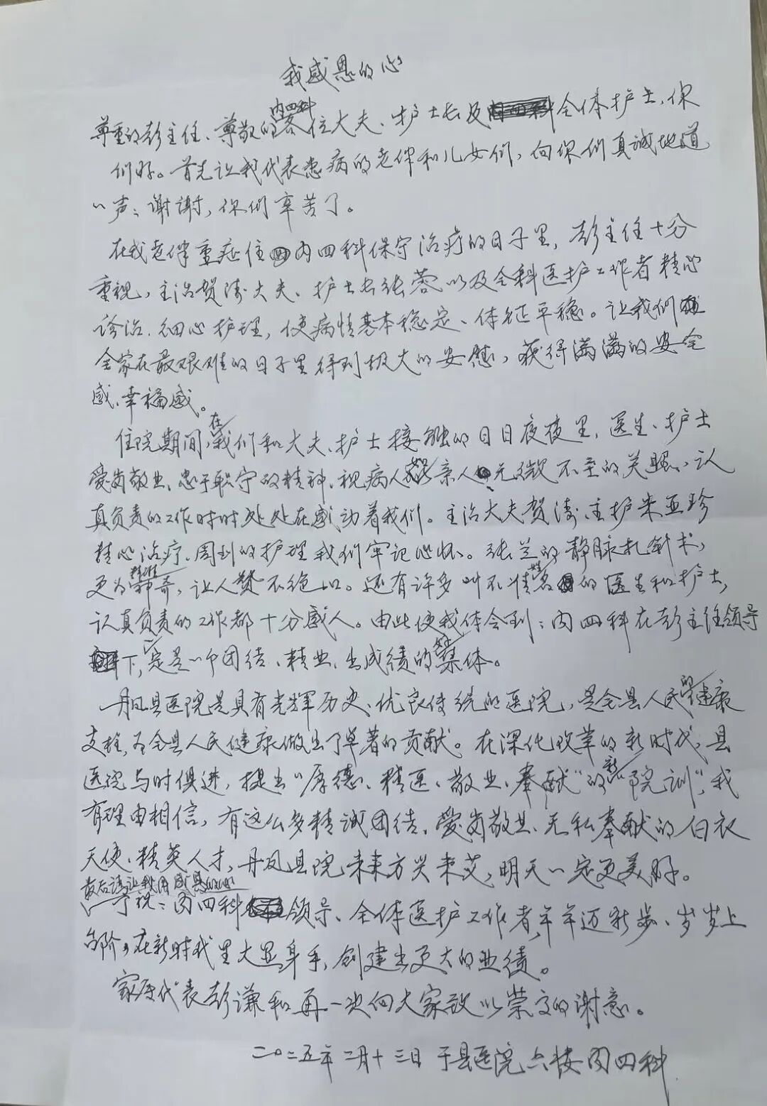 这封感谢信是患者罗女士家属亲笔写成他用朴实无华的语言诉说着在呼吸内分泌科住院期间所感受到的关怀与温暖??????