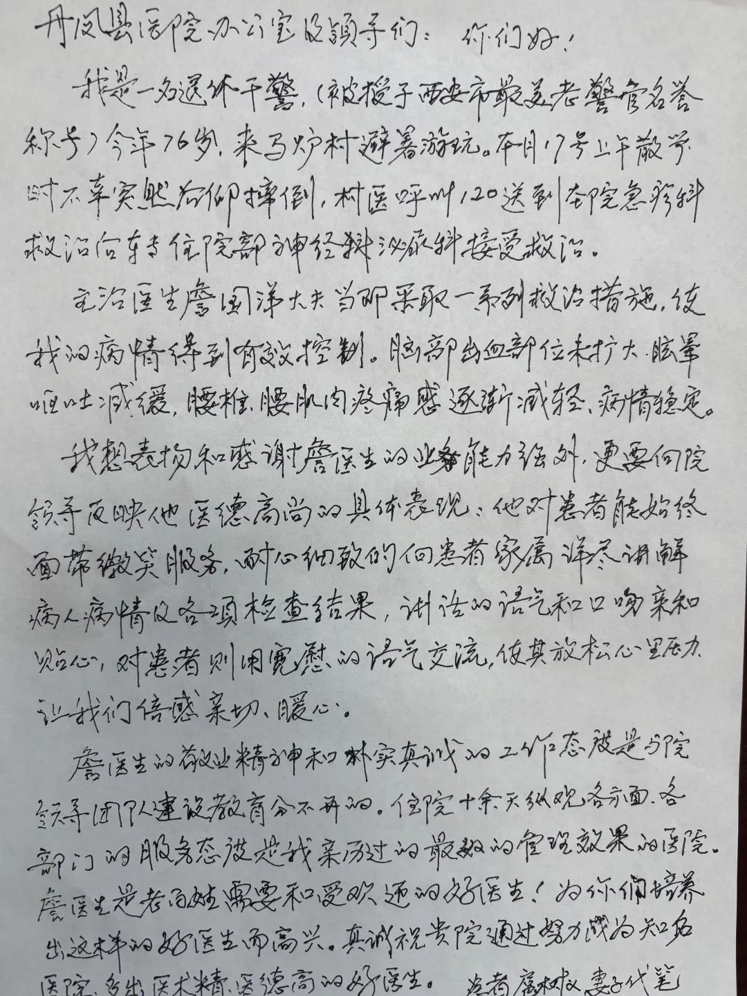 一封外地游客的来信——76岁退休老干警致信感谢丹凤县医院医生
