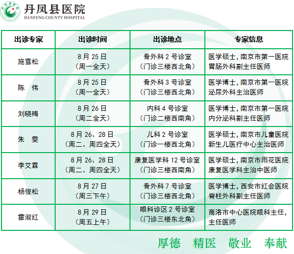 【名医有约】丹凤县医院名医工作室8月25日-29日专家坐诊安排