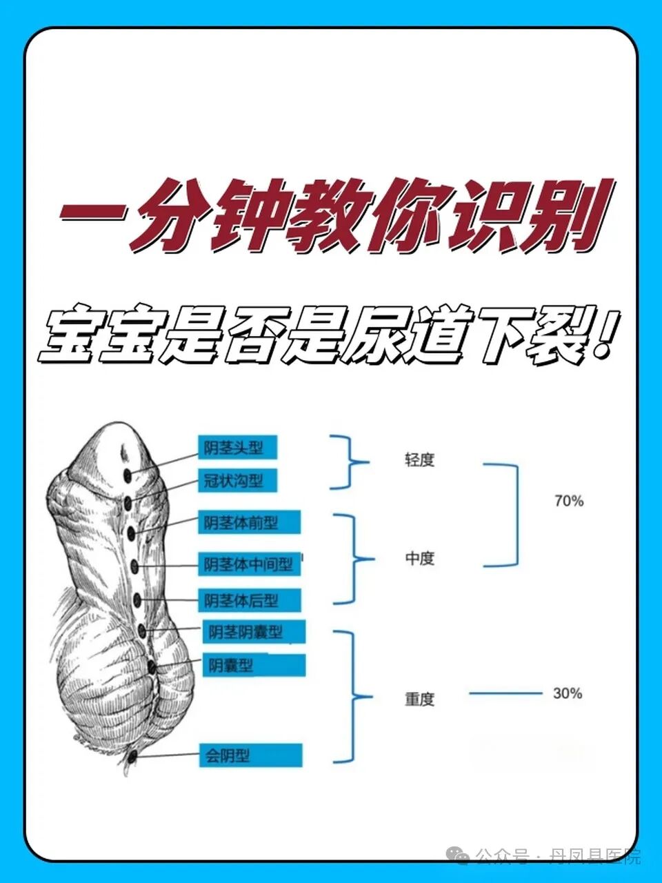 1、尿道下裂。孩子尿道口位置不对,是什么情况?有的小孩出生后尿道口没有在最前方,而是在阴茎中间、根部甚至阴囊上,部分阴茎还是弯的,这时候应高度怀疑是尿道下裂。