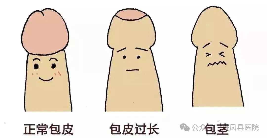 3、包皮过长、包茎。包皮过长是指包皮完全覆盖阴茎头及尿道口,很容易就能翻上去,完全显露阴茎头,如果勃起后阴茎头可以完全外露,就是假性包皮过长。包茎是指包皮长且包皮口过小,阴茎勃起或用手将包皮往下翻时,龟头和尿道口无法露出。如下图所示: