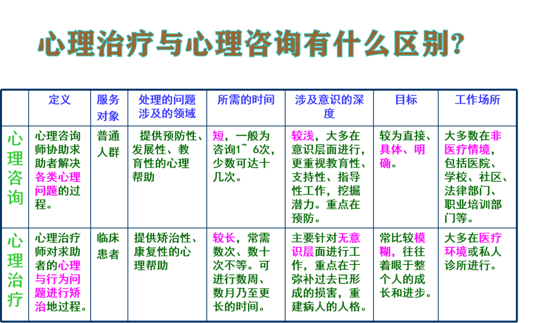 心理治疗师面对的对象是达到疾病程度的人群。培训对象主要是医疗系统内部人员或大专院校心理学专业的毕业生。
