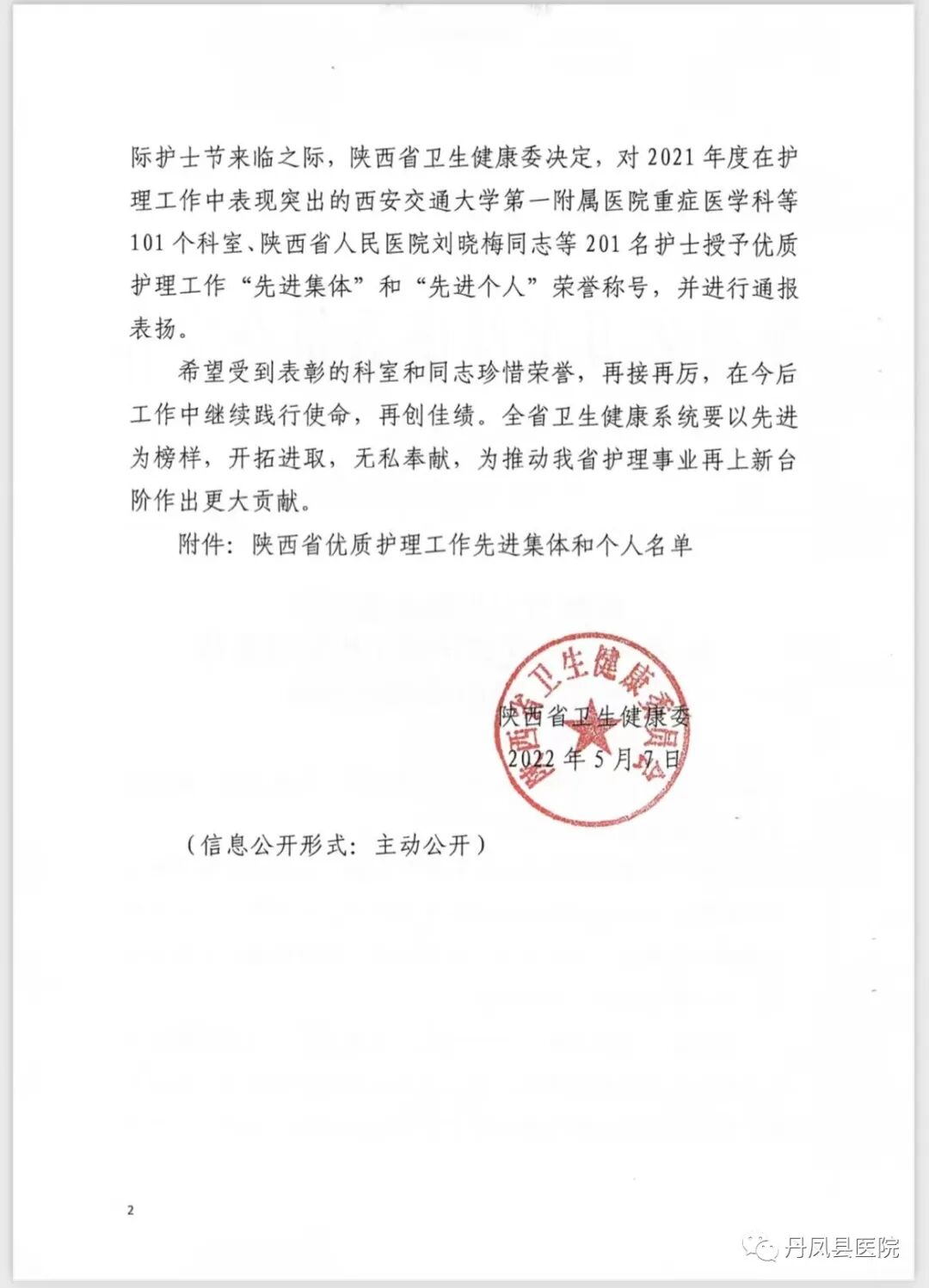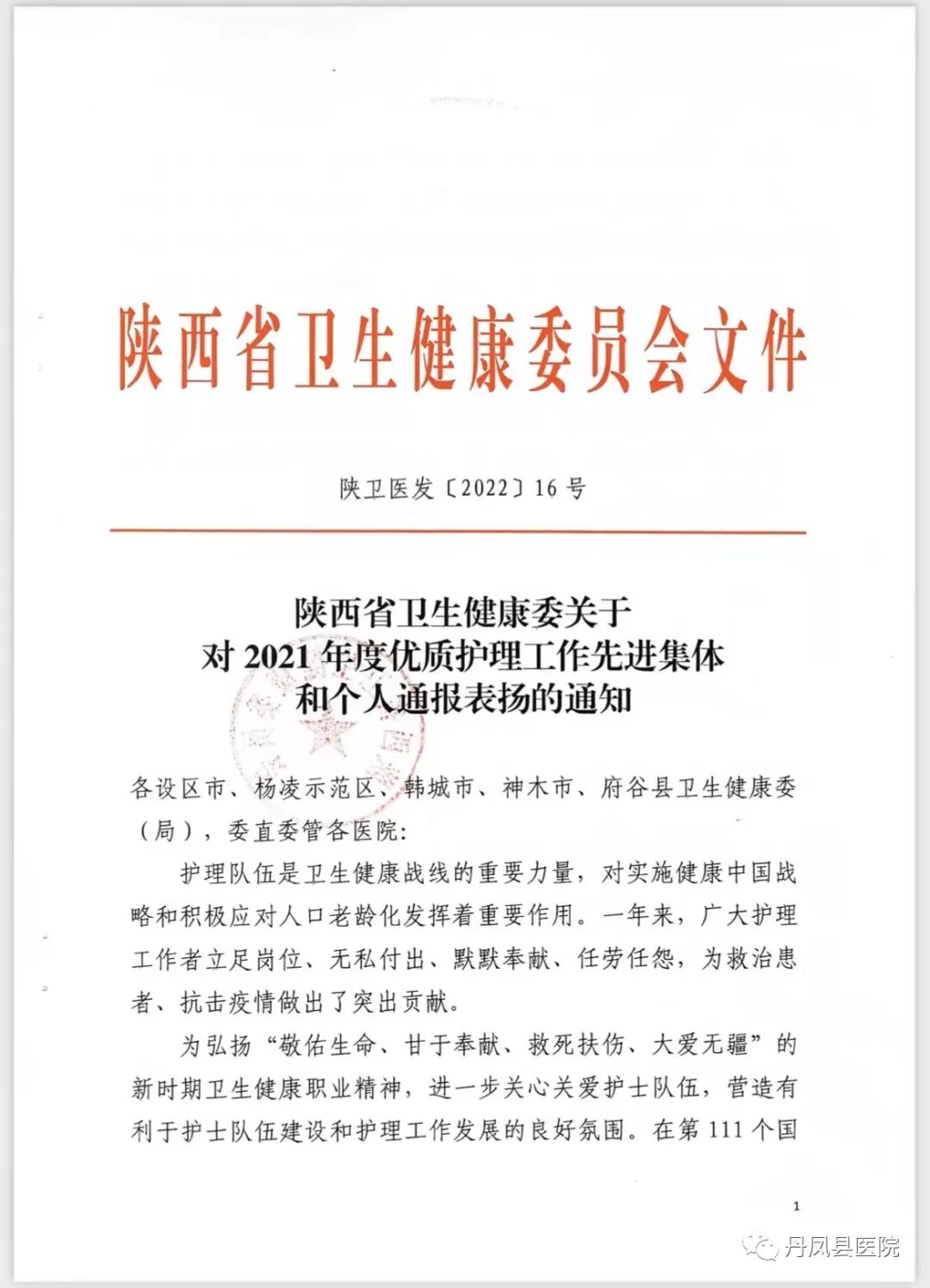 点击上方蓝字,关注我们近日,陕西省卫健委表彰一批优质护理先进个人,丹凤县医院外一科护士长、主任护师周彤荣获“陕西省优质护理先进个人”荣誉称号。