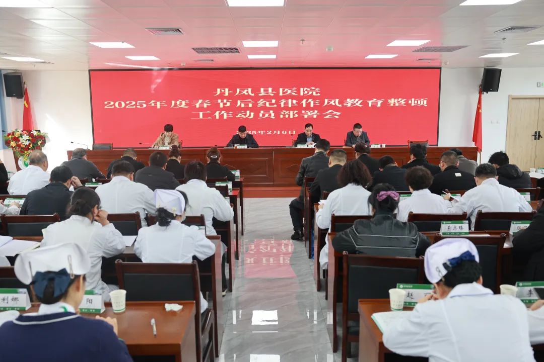 2月6日下午,丹凤县医院召开2025年度春节后纪律作风教育整顿工作动员部署会,院领导班子成员,职能部门负责,临床、医技科室科主任、护士长共100余人参加会议,会议由副院长程涛主持。
